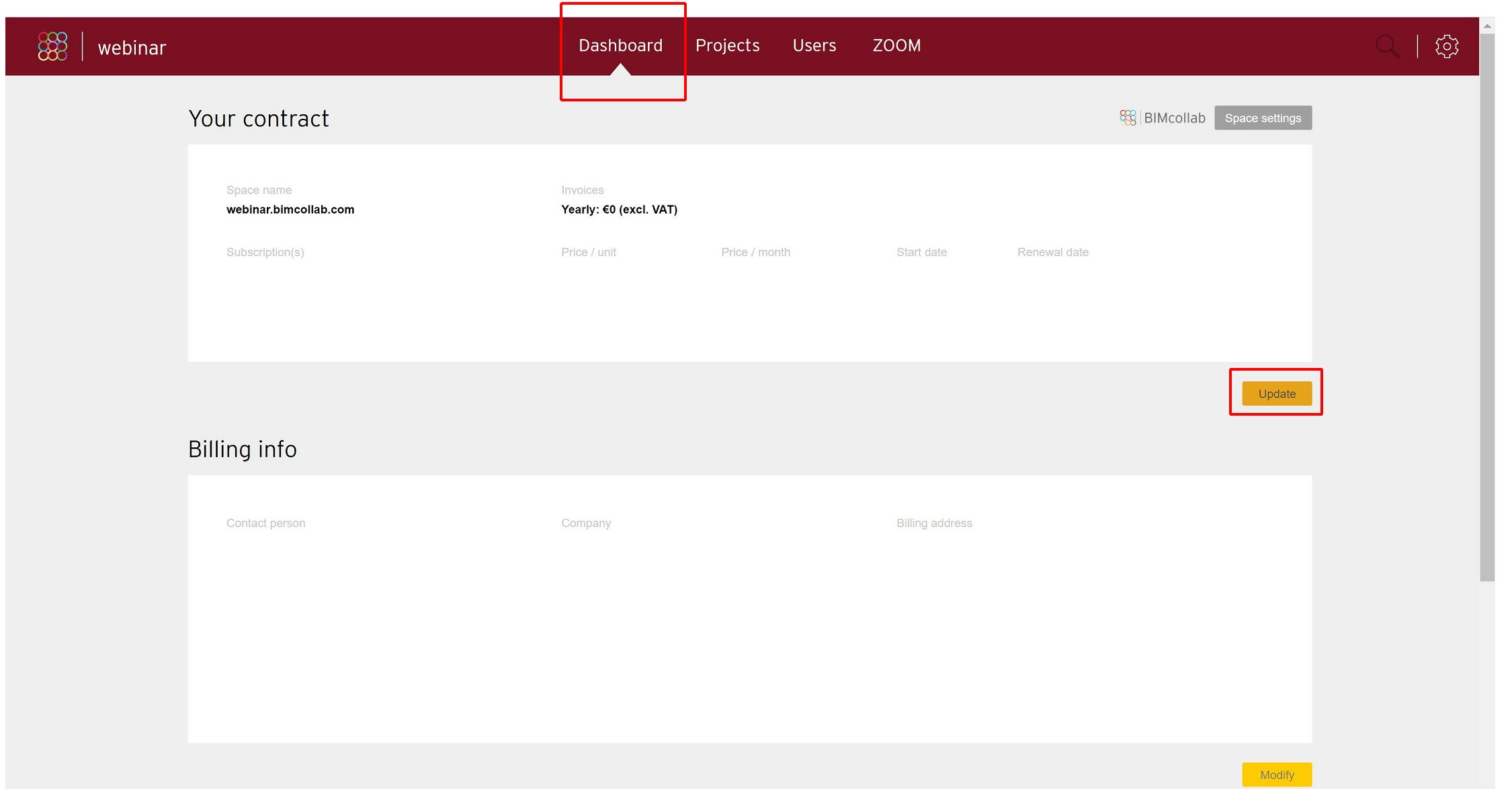 The billing information page allows you to view and edit the bank account and/or credit card information used by the payment gateway for your account billing.